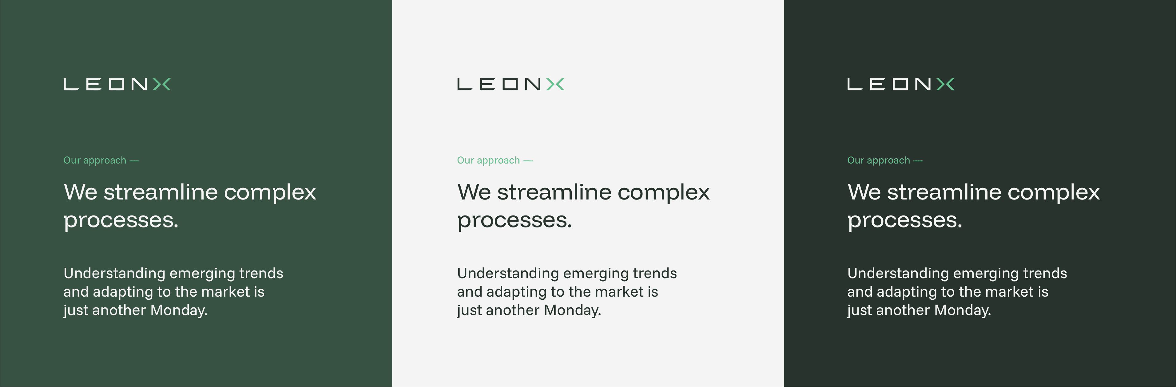 The Leonx mark is built from two angled shapes meeting as an X. One angle represents technology, the other represents people. Rather than feeling like opposing forces, they work together, creating a single, confident mark. The simplicity of the concept belies the depth: two distinct elements, unified through design, just as Leonx unifies tech and human expertise.