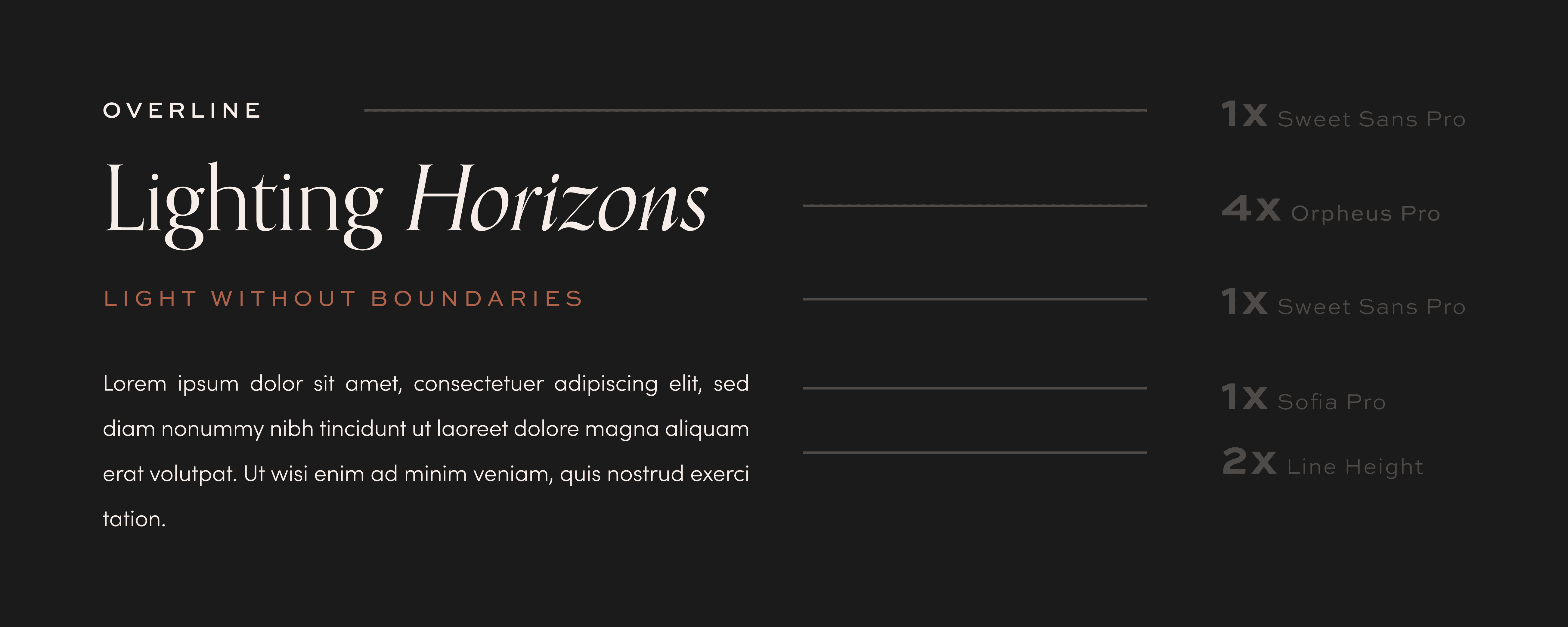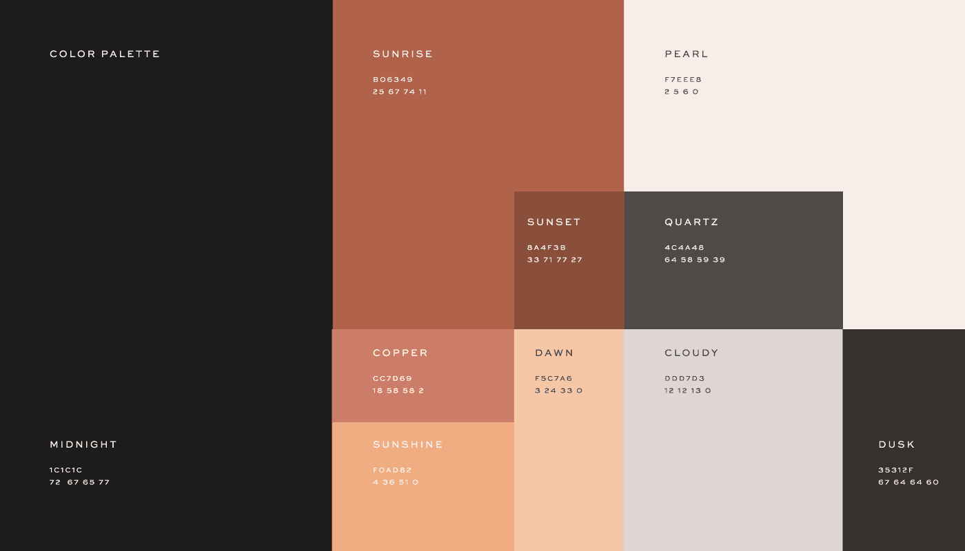 The palette is monochromatic greyscale anchored by warm, soft red hues like basking in a gentle sunrise or sunset. These colors evoke light and shadow while bringing personality and warmth to the system. Typography combines Orpheus Pro as the display font for headlines, bringing elegance and presence, with Sweet Sans as an accent and Sofia Pro as the body copy for clean, modern legibility.