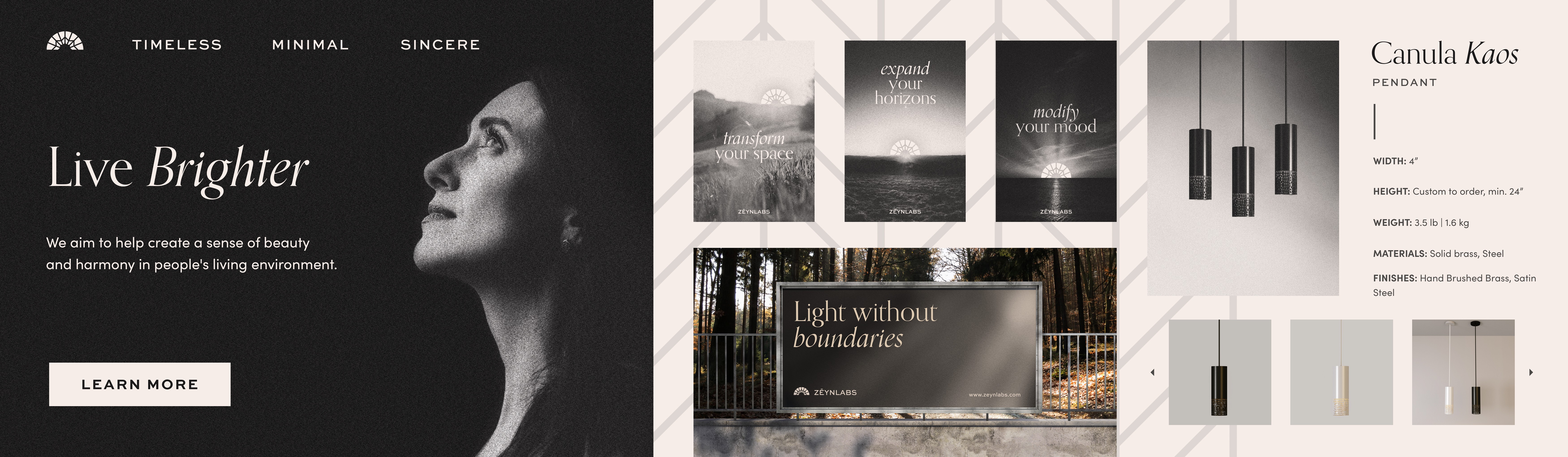 Zeynlabs designs lighting fixtures rooted in a vision of universality. The cofounders are Egyptian but nomadic, having lived across continents. They needed a brand identity that bridged East and West, modern and traditional, creating something that felt neither explicitly Eastern nor Western, but universally in between. The challenge was positioning a product-driven company with a deeply cultural story without being heavy-handed or clichéd.